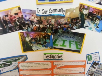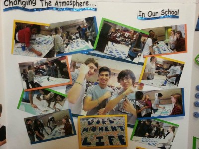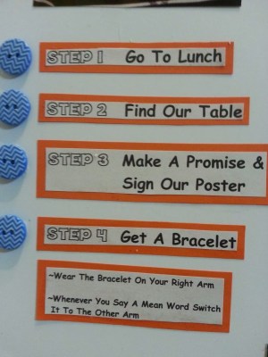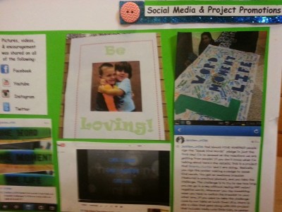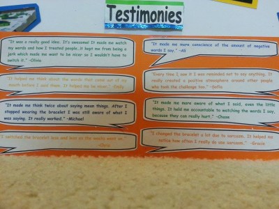 We knew that if we wanted to get the attention of our peers that it couldn’t be us in the video, which is why we took this approach. We showed the video to everyone in our school. We then sat at a table for a full week, at every single lunch. Students came and signed the poster/pledge and got a bracelet that said “One Word One Moment One Life”. The challenge is to see how far you can go in a day without saying any mean words. On the first day we ran out of all 500 bracelets & had to order more. We had over 1000 people take the challenge. God was at work for sure.
